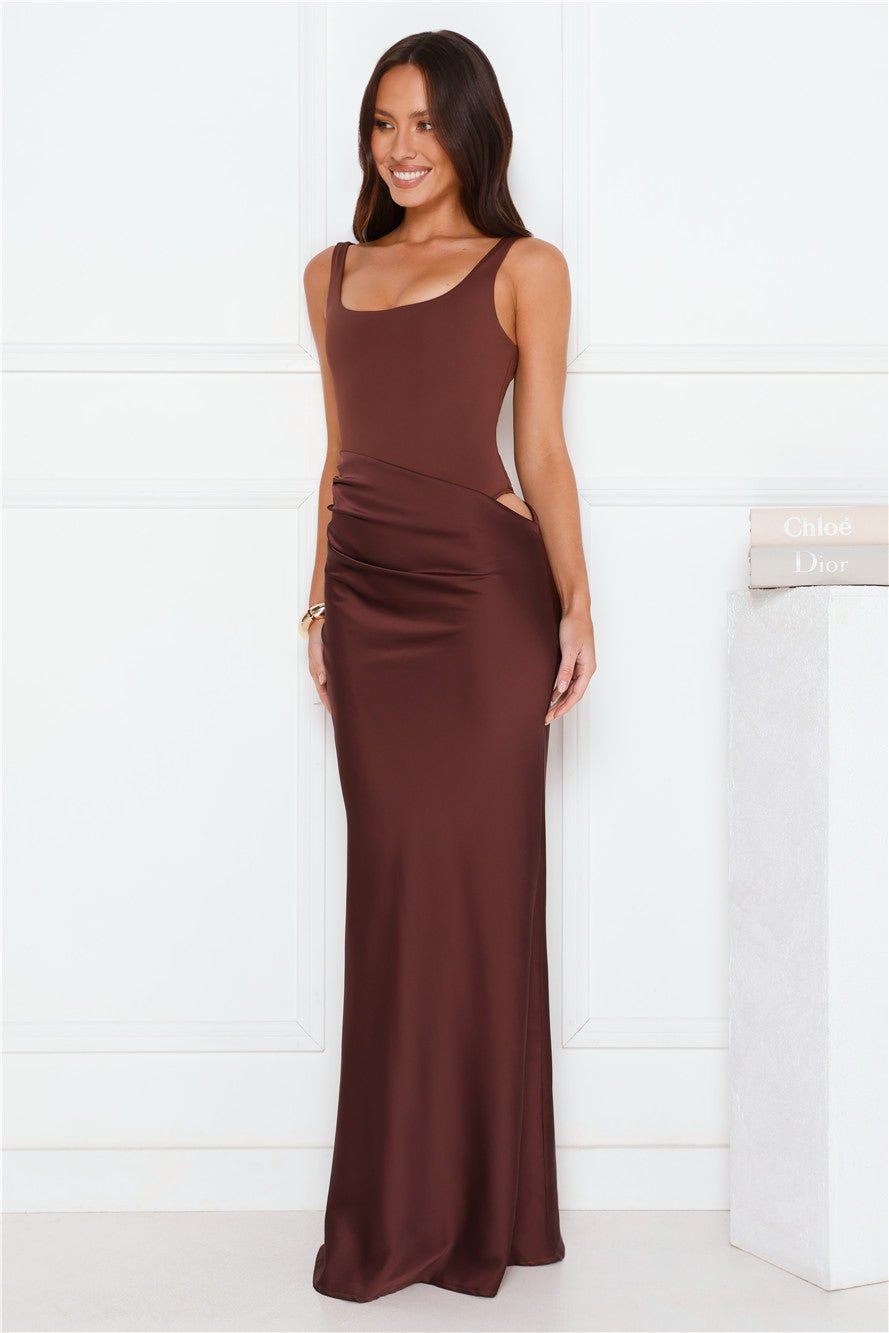 The Effortlessly Yours Satin Maxi Dress features a stretch bodysuit-style top with convenient snap closures, a flowing satin skirt and a slit to the waist. Style with heels.Â