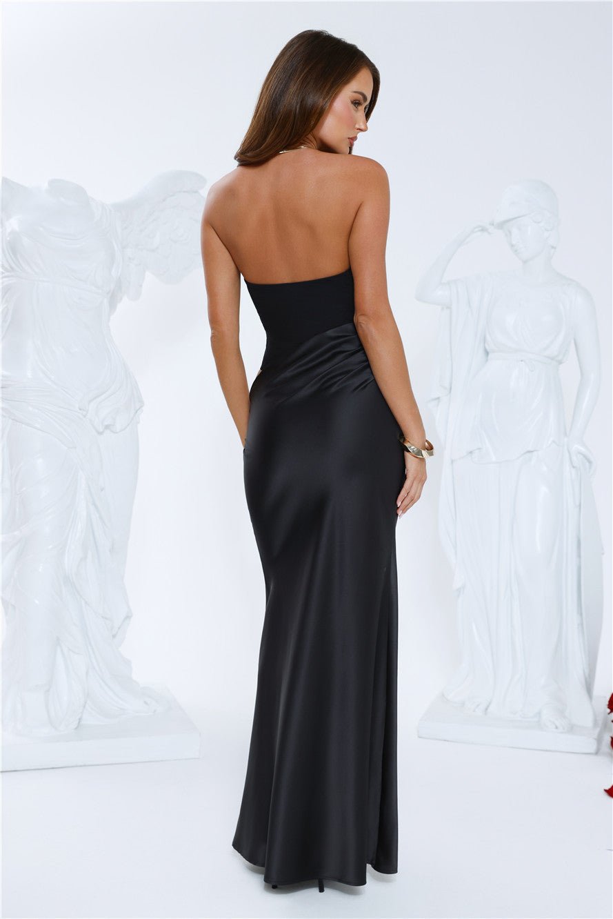 The Elevated Simplicity Strapless Satin Maxi Dress brings sleek design and modern detailing together in one statement silhouette. Featuring a stretch mesh bodysuit-style top with a secure closure, cutout waist, and a strapless neckline, this dress flows into a satin maxi skirt. The soft, fluid skirt completes the look with timeless elegance.
