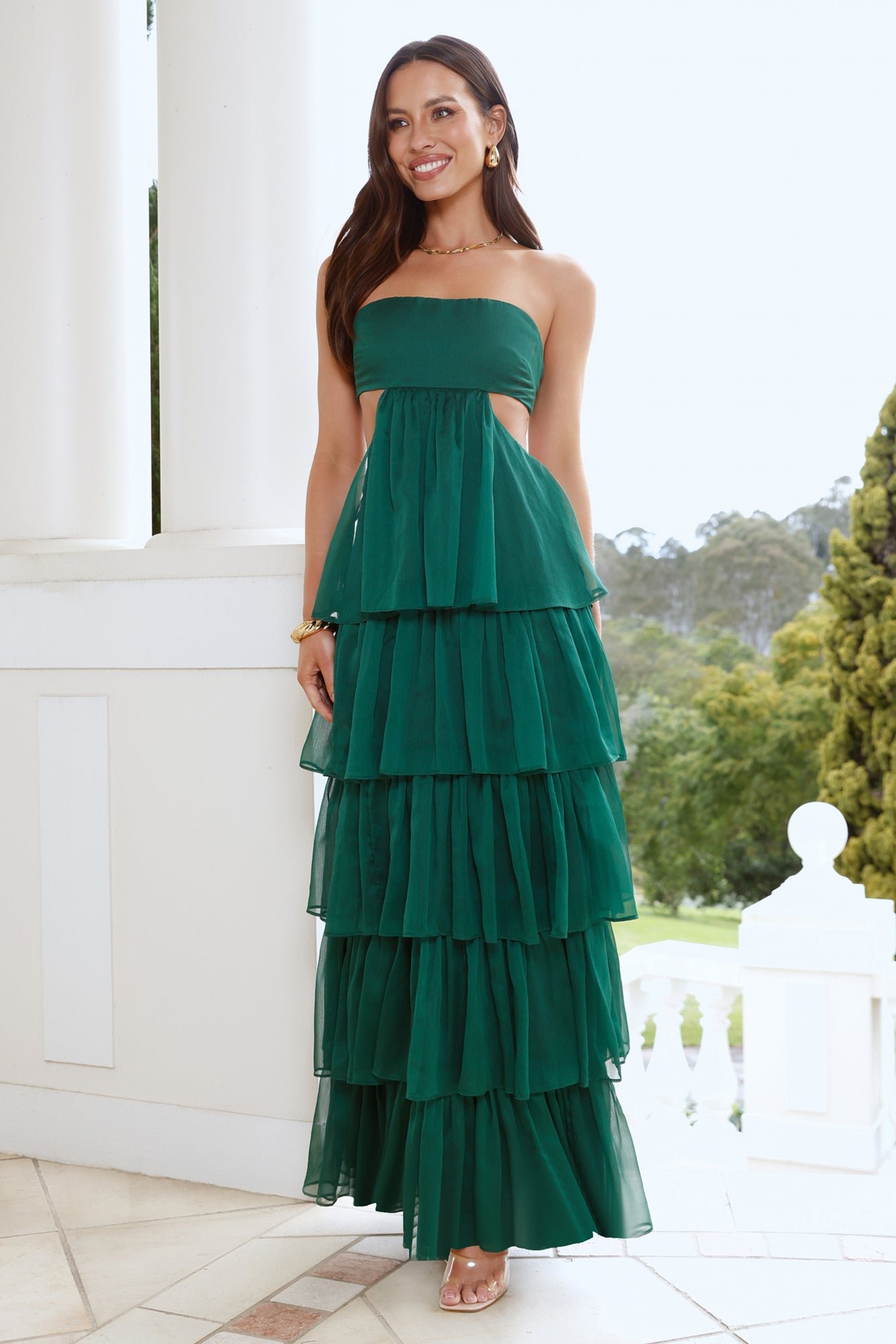 Set the style standards in the Luxe Mode Strapless Maxi Dress. It features an elastic back, a cutout to the waist and a tiered frill skirt. Style with heels and curls.Â