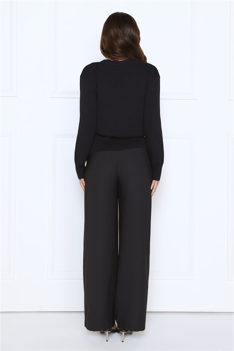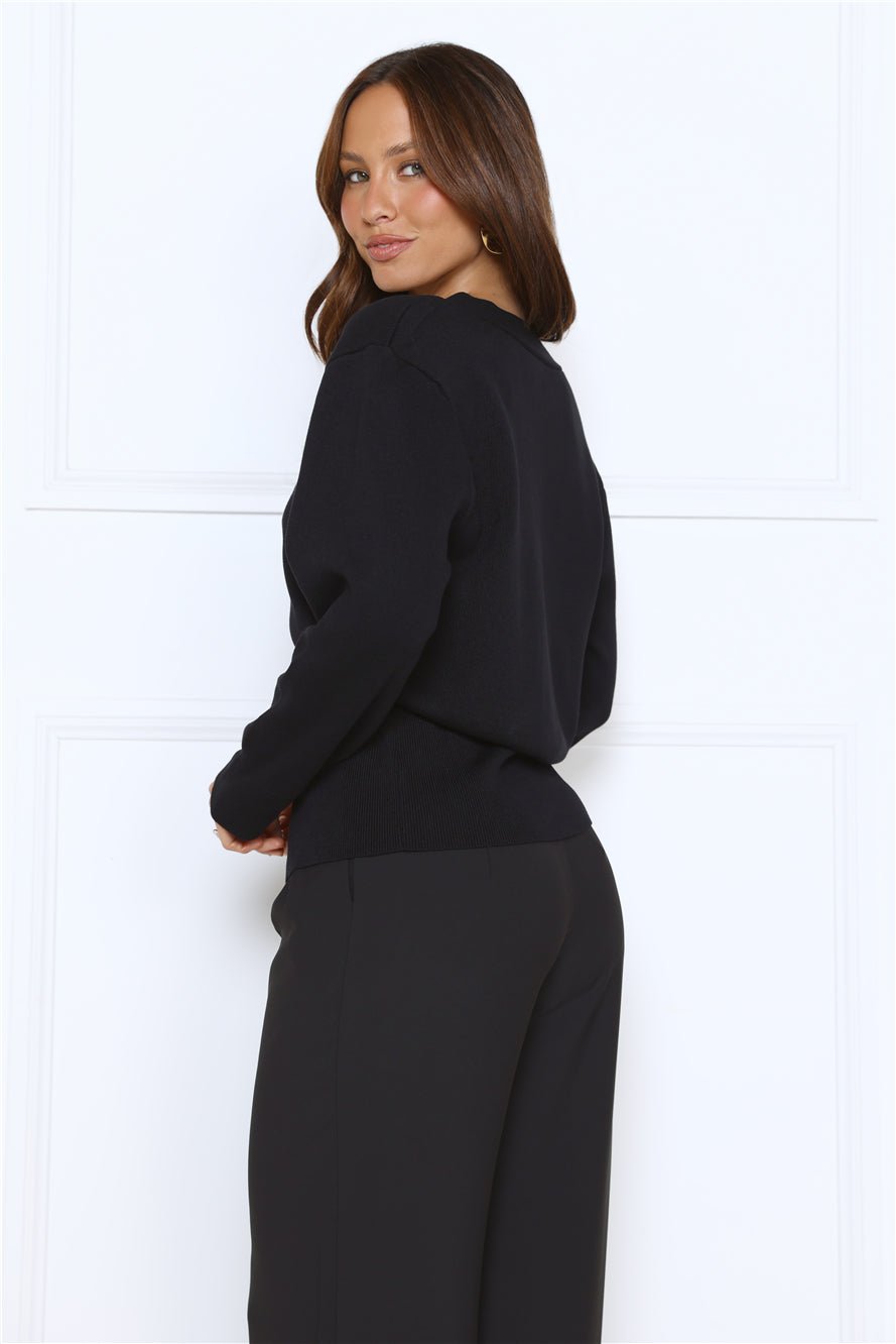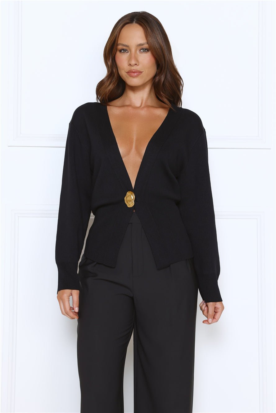 Add a touch of elegance with the Noir Allure Knit Cardigan. Featuring a soft knit, long sleeves with cuffed detailing, and a chic gold closure, this cardigan is perfect for layering or wearing alone. Style with tailored pants or a midi skirt for a sophisticated, polished look.