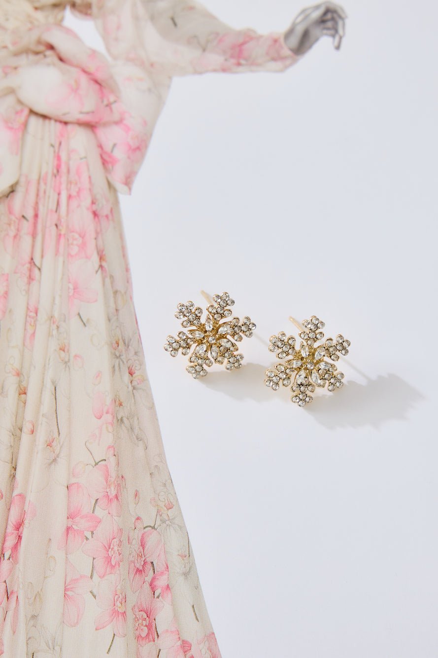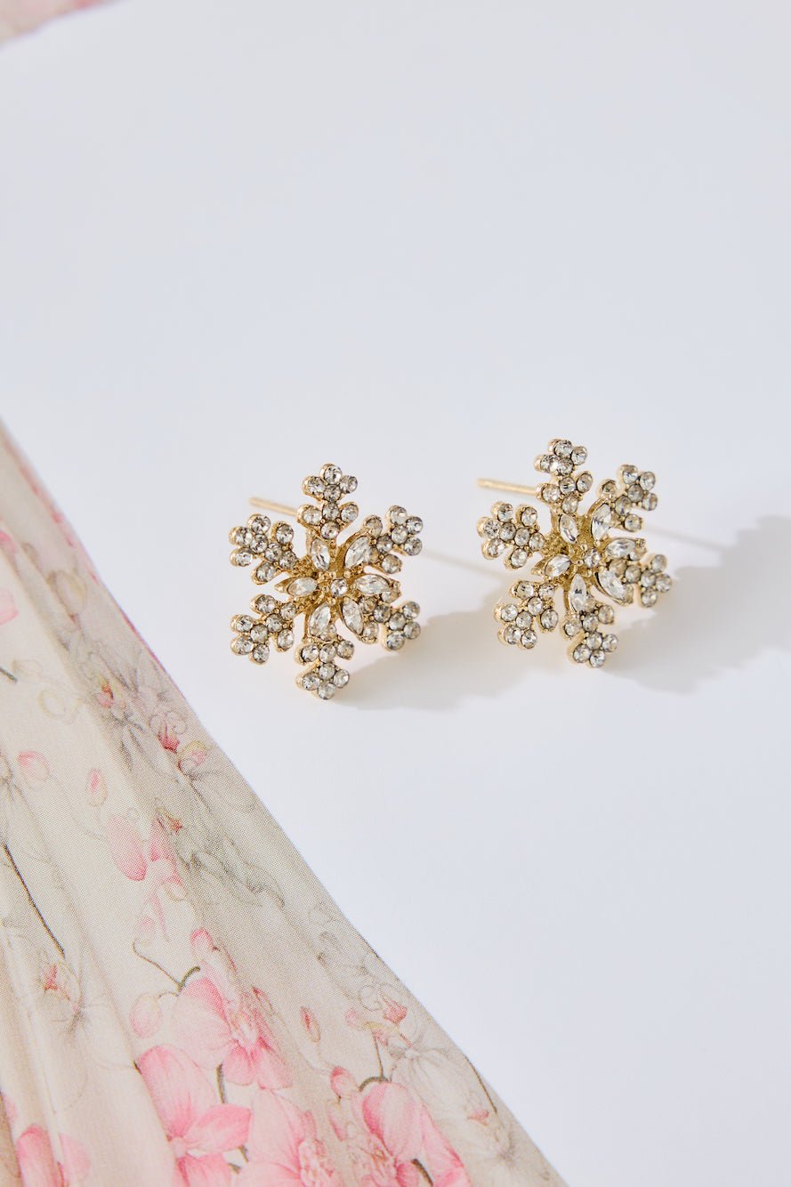 The Snowflakes Earrings feature a polished metal construction with a delicate snowflake design, adorned with sparkling diamante details. These earrings capture the essence of winter wonder and holiday cheer, adding a touch of elegance to your festive look.