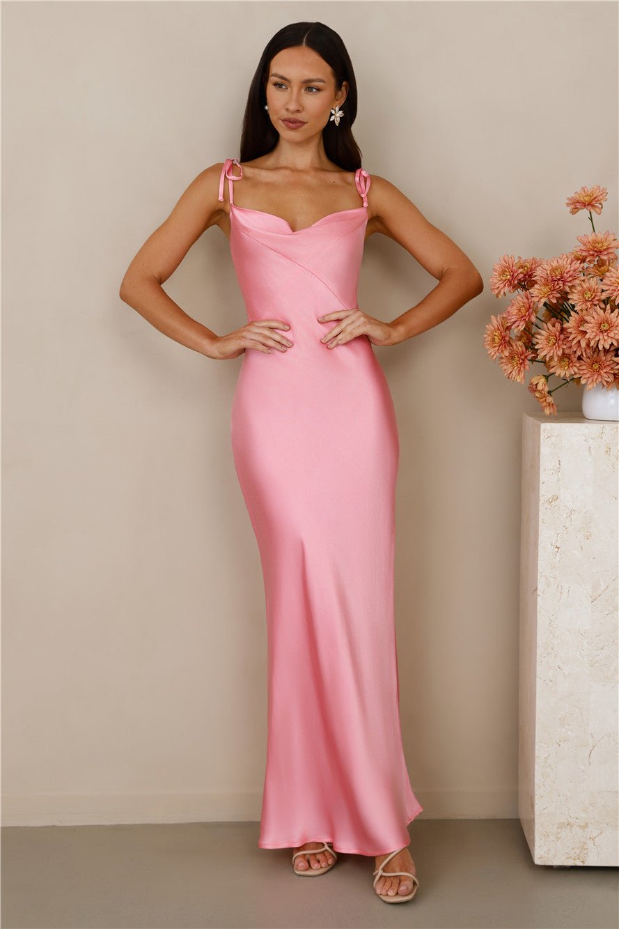 Crafted from luxurious satin, this dress showcases opulence and grace at its best. Featuring a cowl neckline that drapes with effortless allure, adding a touch of refined glamour to the look. Accentuating the shoulders are delicate tie-up straps, a charming detail that lends a hint of whimsy to the classic design.Â